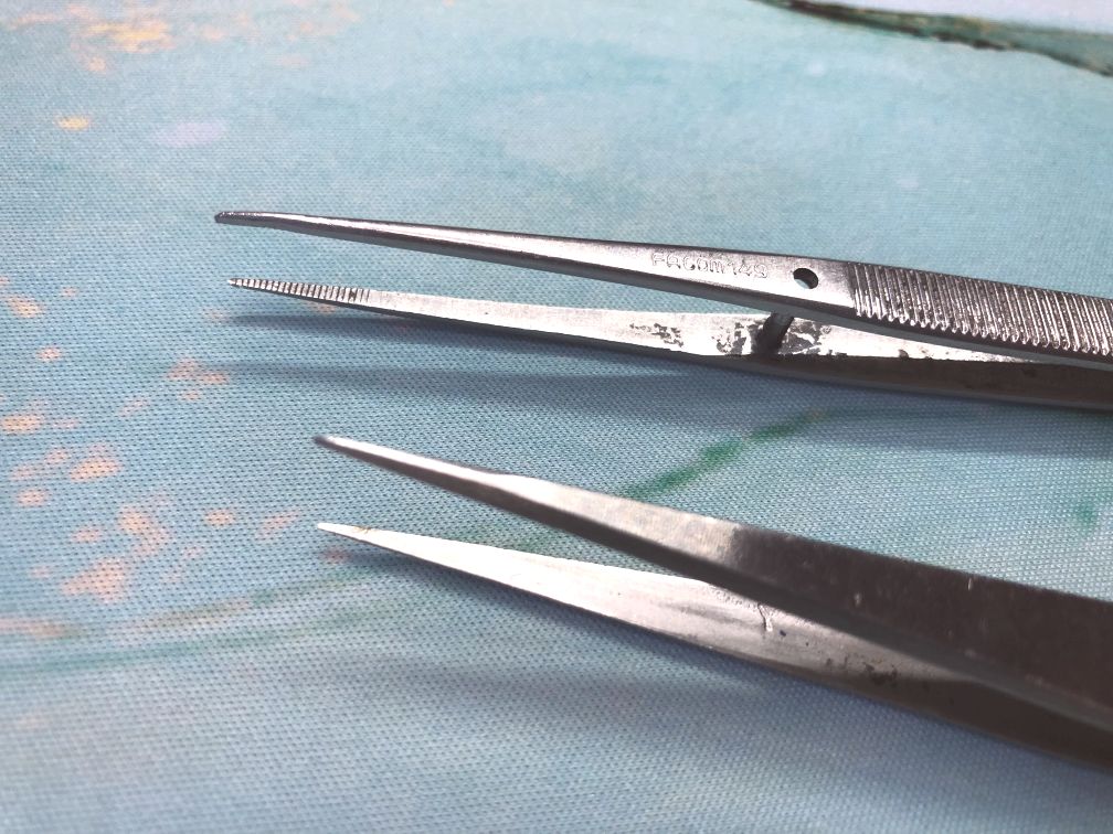 Pour cela, munissez-vous d’une pince Brucelles, aussi appelée "pince de précision". J’en ai choisi deux, une longue qui est très maniable et permet d’agir avec suffisamment de force sur les fils à replacer. La seconde est pointue et plus courte. Elle est plus précise que la première, grâce à son extrémité plus fine. Par contre, elle ne permet pas toujours d’agir sur les fils avec la force nécessaire.