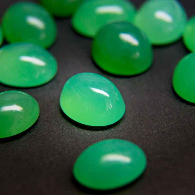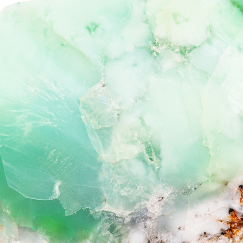 La Chrysoprase est une variété de calcédoine (quartz microcristallin) qui contient de fines inclusions de Nickel. C’est ce qui lui donne sa couleur verte plus ou moins prononcée. Lorsque sa couleur est pâle voire presque blanche, on peut la confondre avec la jadeïte.