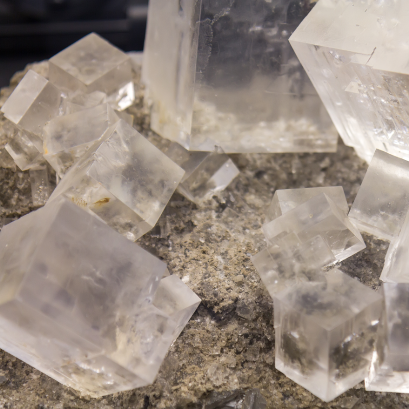 Son nom vient des mots grecs Hals et Lithos, qui signifient sel et pierre. La halite est l’autre nom du sel cristallisé, ou sel gemme, tel qu’on le trouve par exemple pour améliorer le goût de nos assiettes. Son appellation lui vient de sa présence très commune dans le sol terrestre, dans de nombreux sites de mers ou de lacs salés anciens et asséchés, souvent enfouis. Le sel cristallisé sous terre a formé de grands cristaux souvent cubiques qui remplissent la place laissée vide par l’eau évaporée. Certains gisements sont remontés à la surface de la terre avec les mouvements des plaques tectoniques. On en extrait au Canada, aux Etats Unis, mais aussi en Europe (France, Autriche, Espagne, Roumanie…) ou dans les montagnes de l’Himalaya.