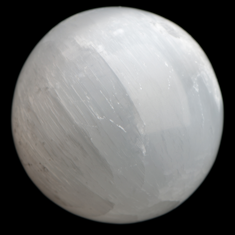 Cette pierre est une variété de gypse blanc fibreux, translucide à cristallin, le plus souvent d’un blanc immaculé, parfois légèrement rosé. Ses cristaux sont parfaitement alignés, et paraissent légèrement grisés selon l’orientation de la lumière.