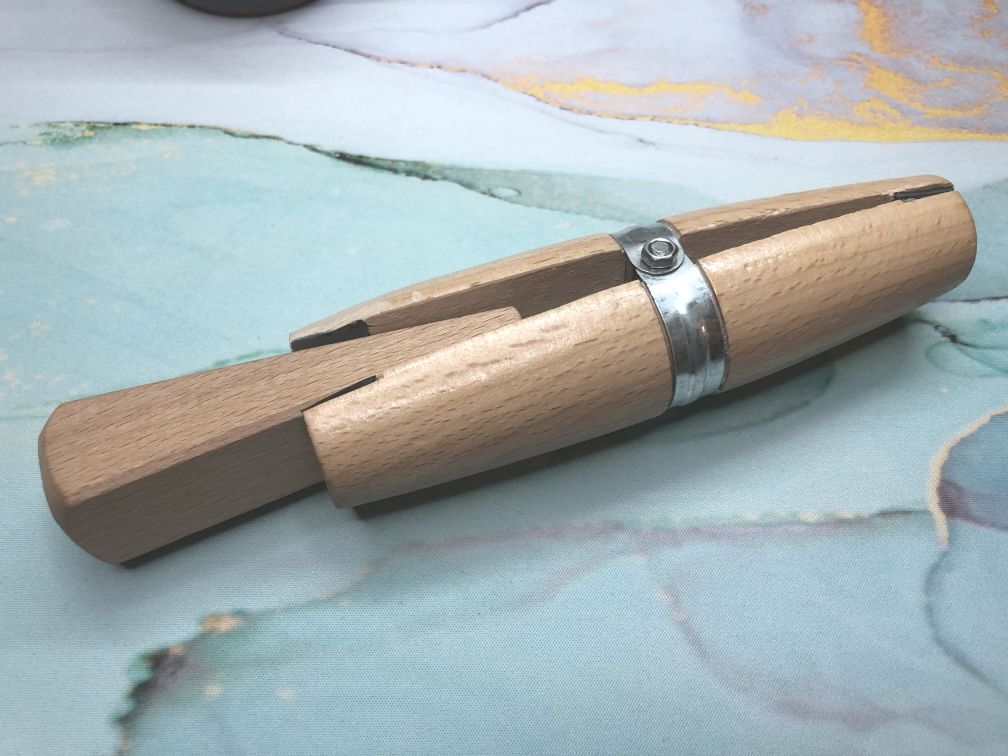 Enfin, un outil dont je suis très heureuse d’avoir fait l’acquisition, c’est un étau à cale. Il me sert à tenir l’extrémité de mes fils pour réaliser les tissages.