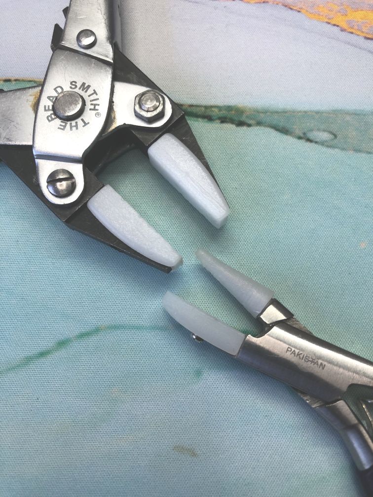 J’ai une pince à mors plats, et une composée d’un mors plat et d’un cylindrique. Je les utilise pour aplatir les motifs à plat ou en arrondi. La pince plate me sert aussi pour aplatir les fils métalliques tordus, en les serrant dans la pince. Il est possible de redresser les fils en les faisant glisser dans la pince fermée. Mais cette manière de faire use plus profondément les mors de la pince.