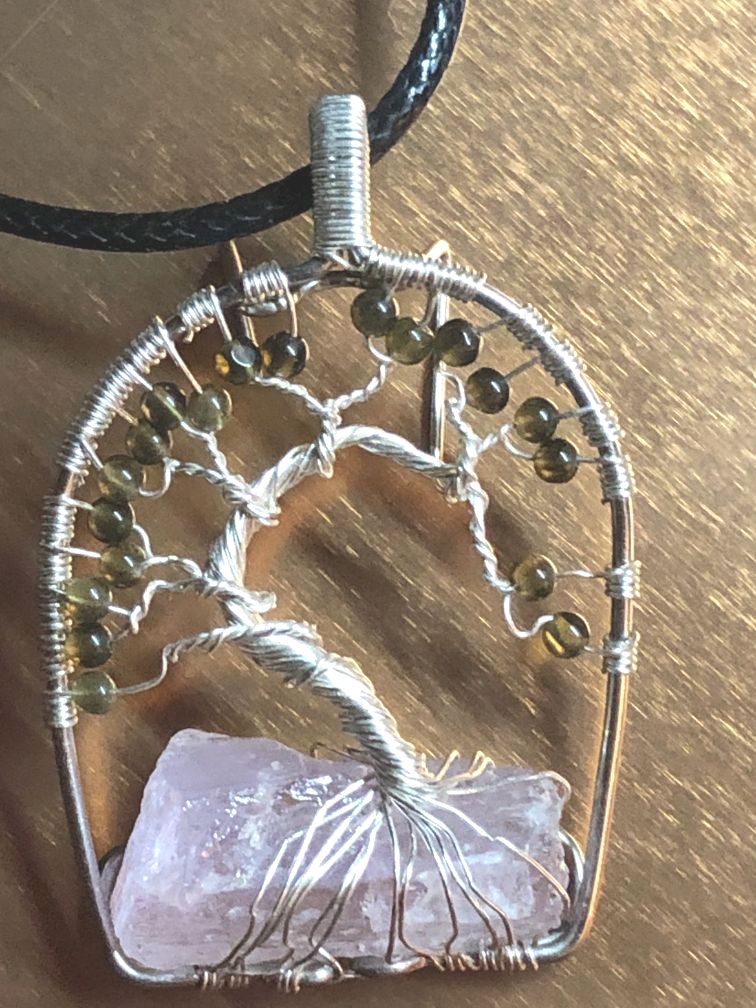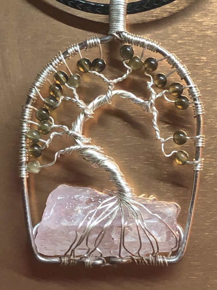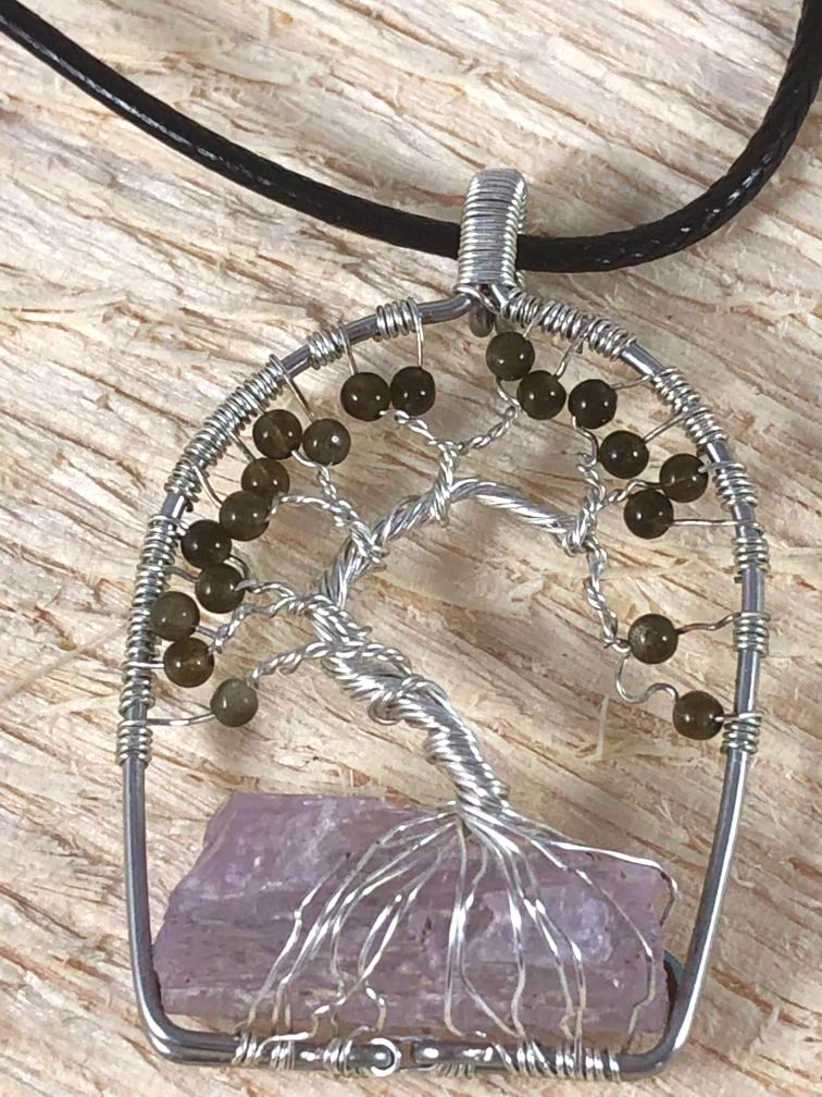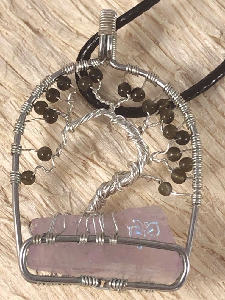 La Kunzite est une pierre très douce, de la famille des spodumènes. Elle capte la lumière et la renvoie en reflets éclatants. Elle est accompagnée de perles d’obsidienne translucides et délicates.