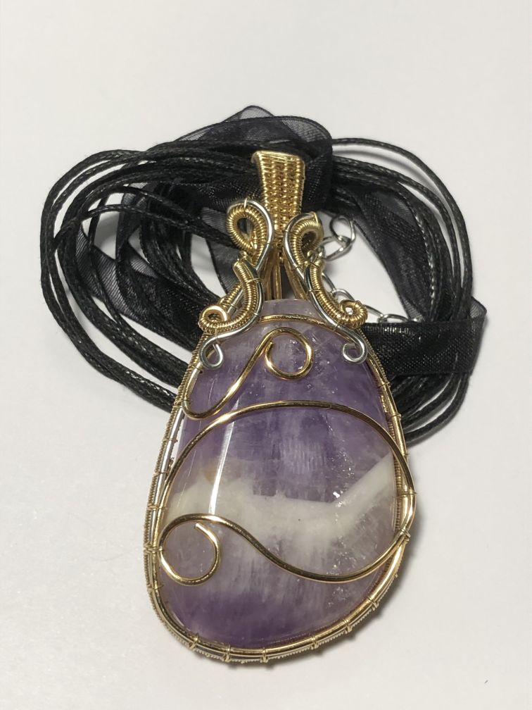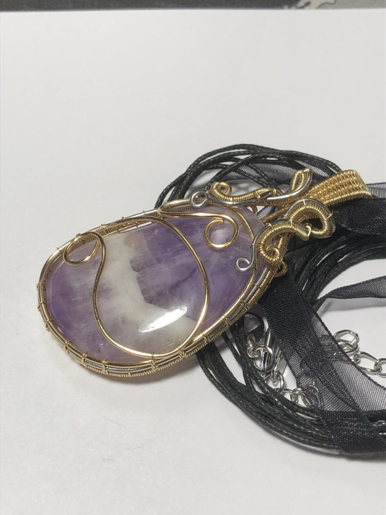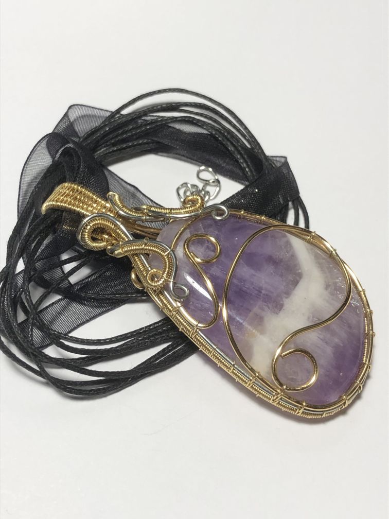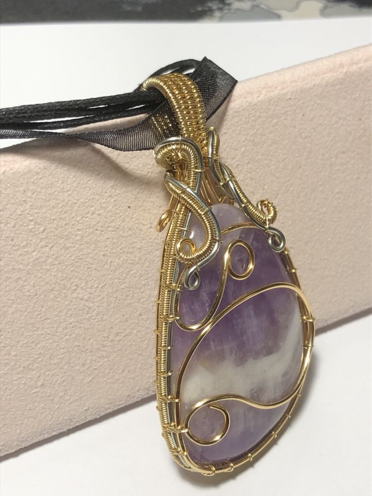 Deux couleurs de cuivre enlacés pour habiller cette grande améthyste à chevron, en pierre roulée.