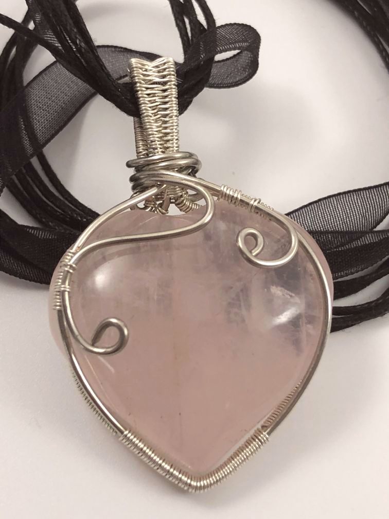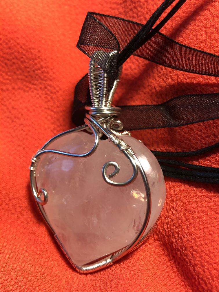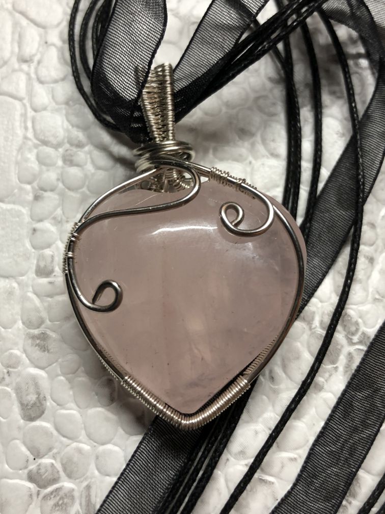 Cœur en quartz rose épais, habillé de cuivre argenté traité anti ternissement. Il est accompagné d’un cordon multibrin coton et organza.