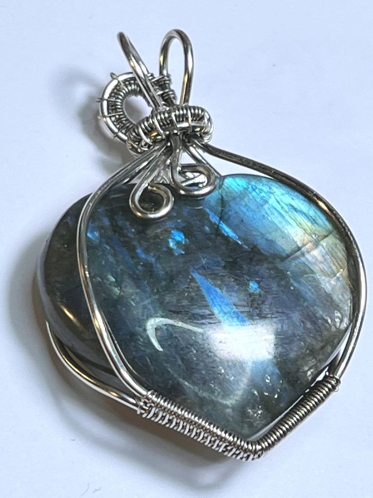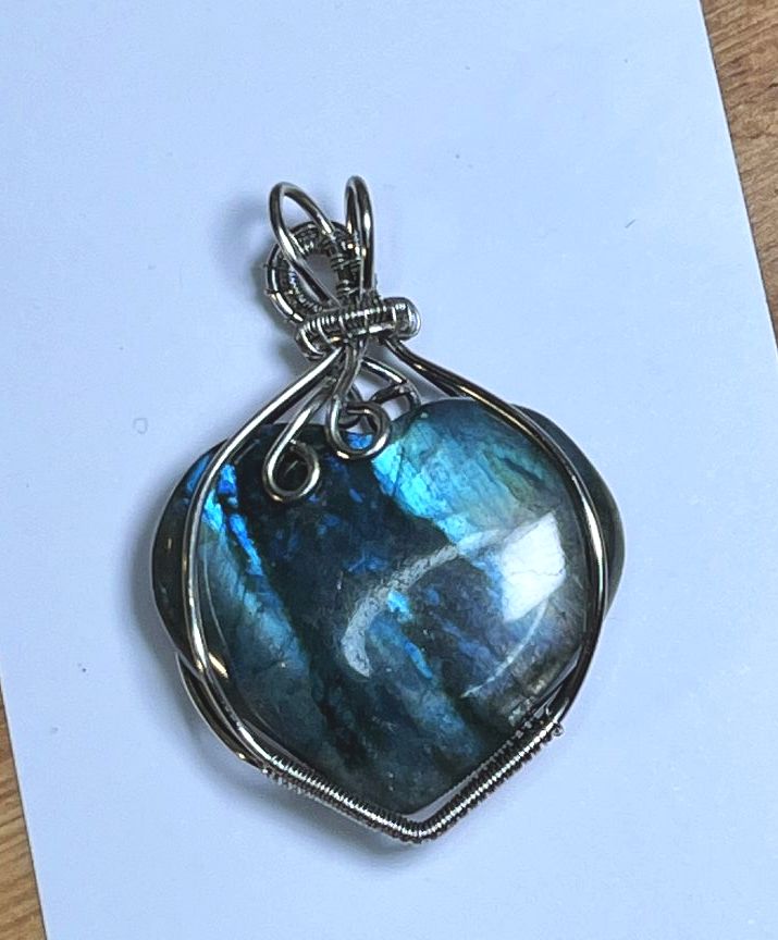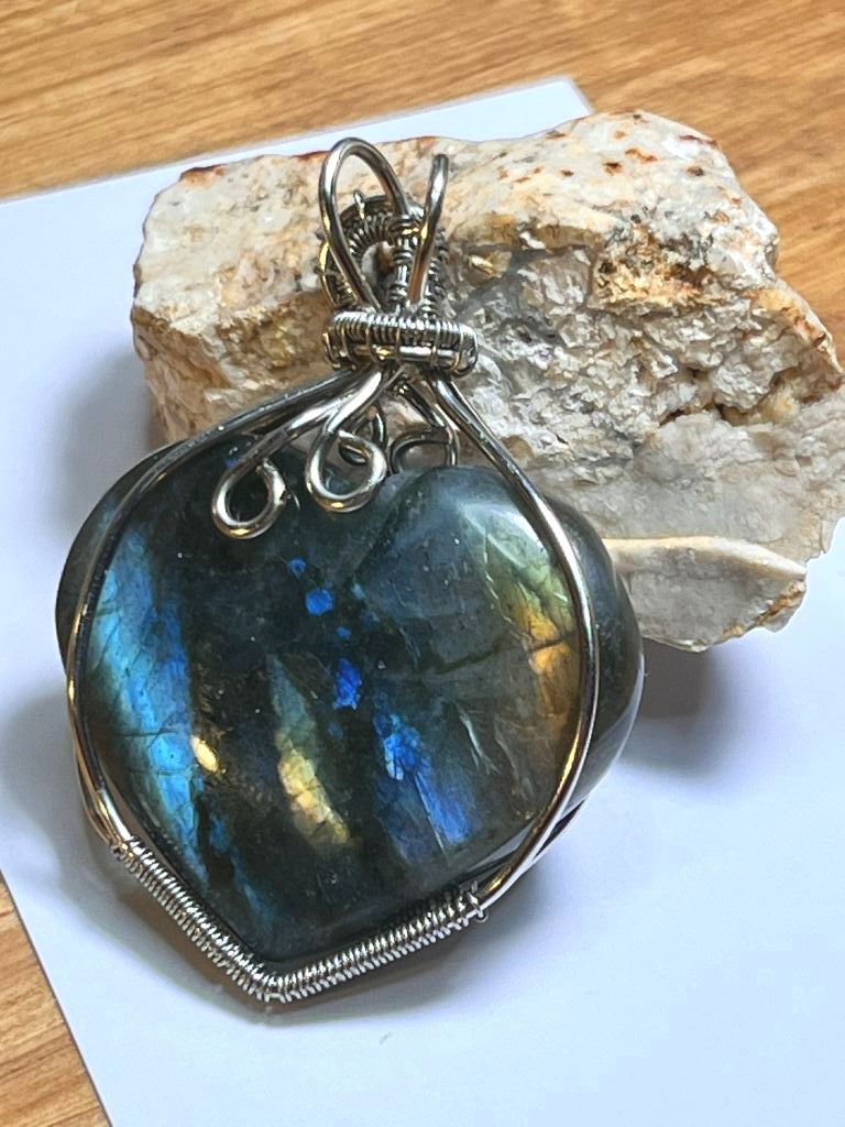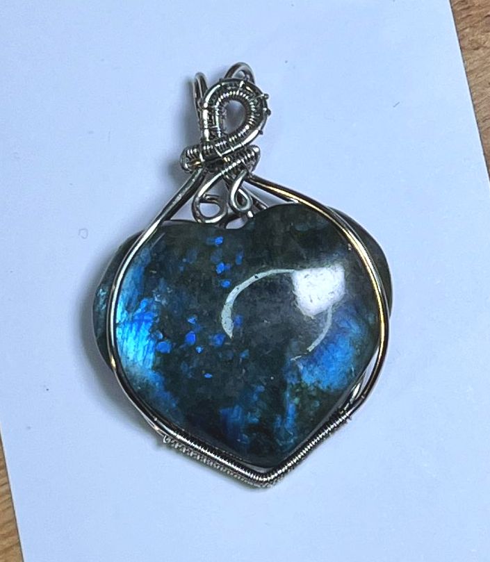 Labradorite en forme de cœur, aux reflets bleu et vert intenses, un peu de jaune et de rose. Connue comme pierre de protection, elle éloigne les énergies négatives et stimule l’intuition.