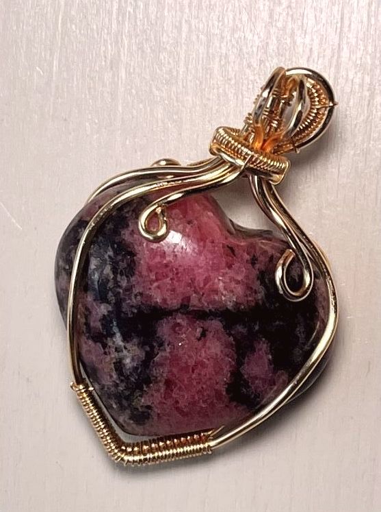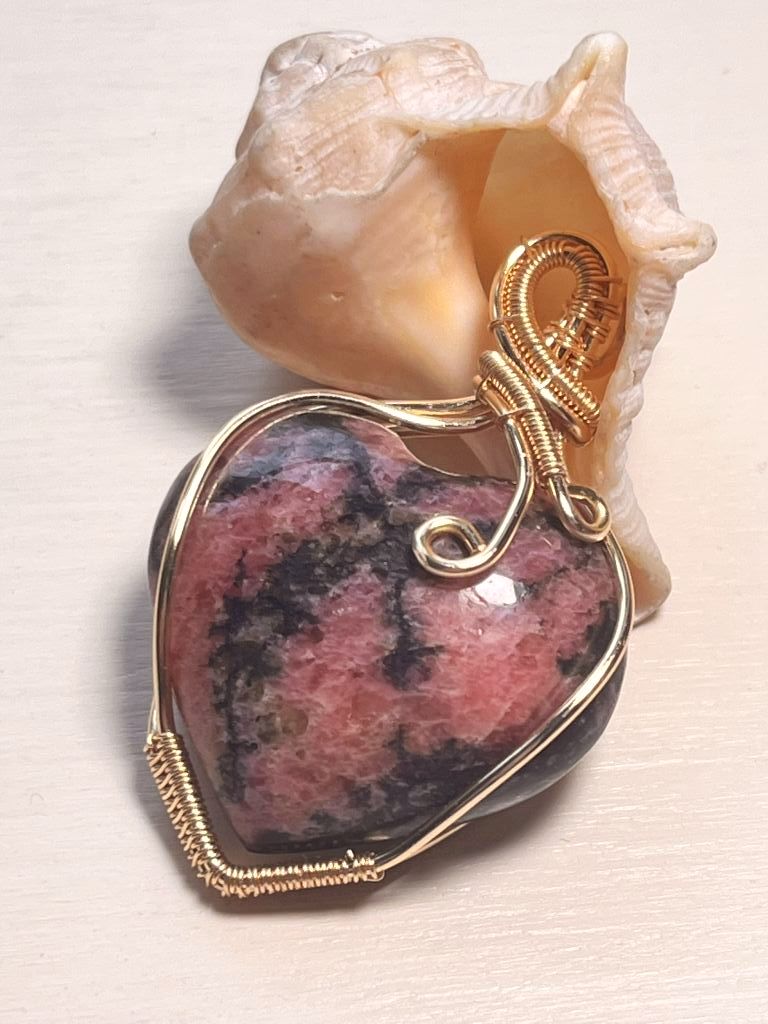 Pendentif réalisé autour d’une Rhodonite taillée en coeur et habillée de cuivre doré. Ce pendentif est réversible.