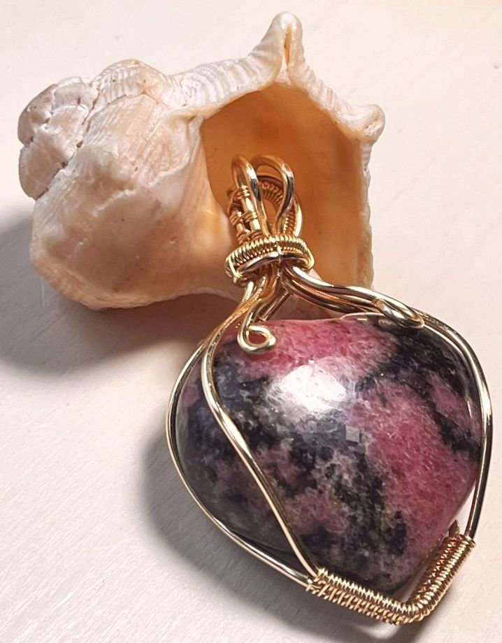 Apportez une touche d’élégance à votre tenue avec ce pendentif unique en rhodonite, soigneusement serti de cuivre doré.
