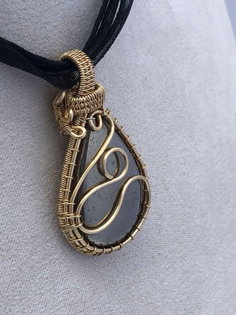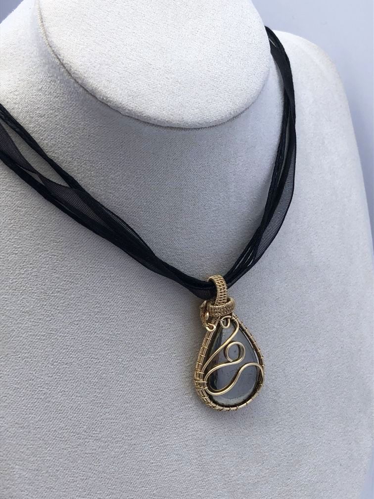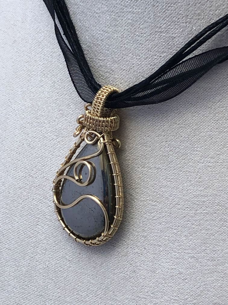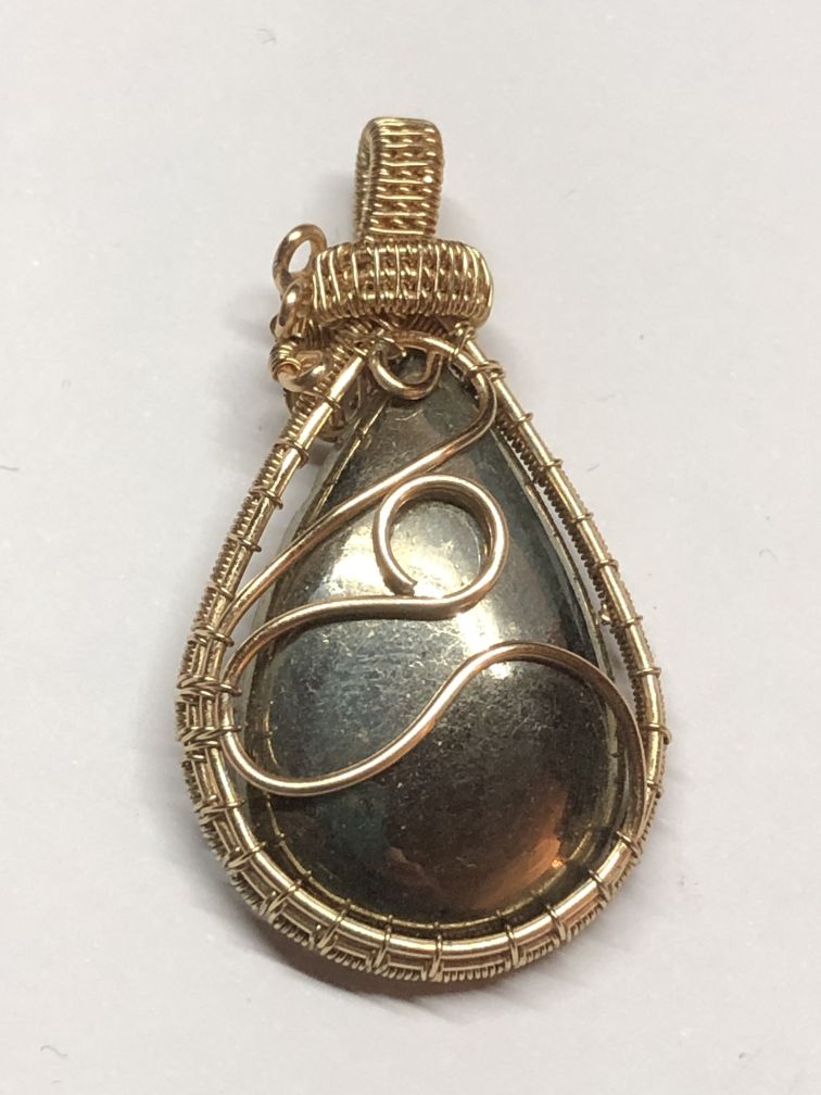Pyrite polie en forme de goutte et habillée d’un tissage et d’une arabesque en cuivre doré.