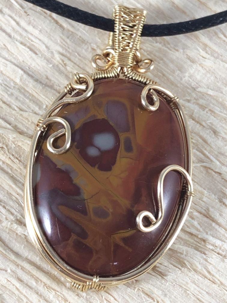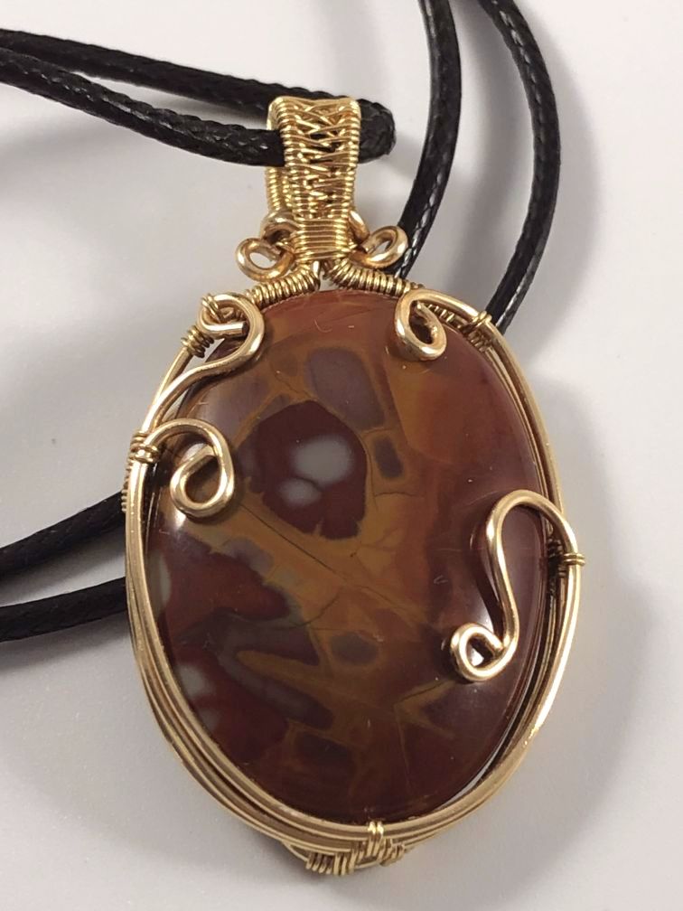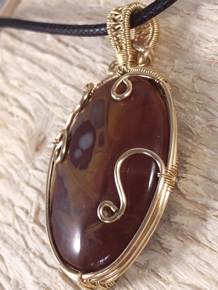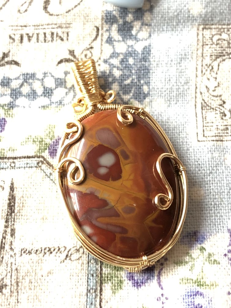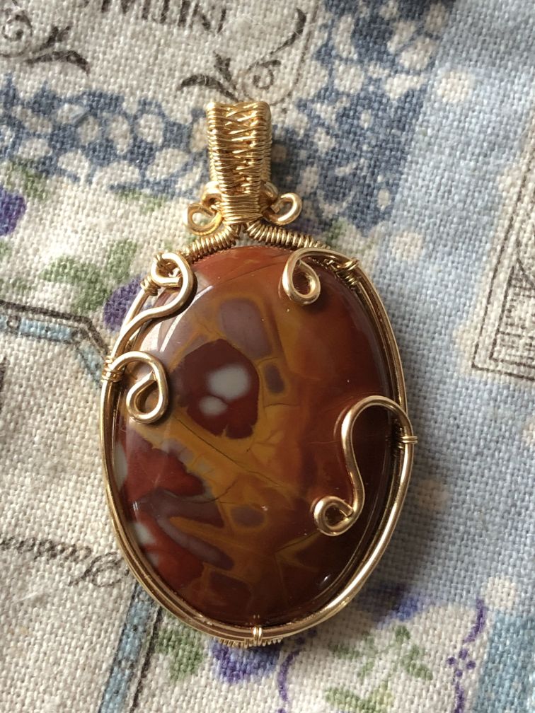 Jaspe mokaïte aux couleurs intenses, habillée de cuivre doré et d’arabesques discrètes.