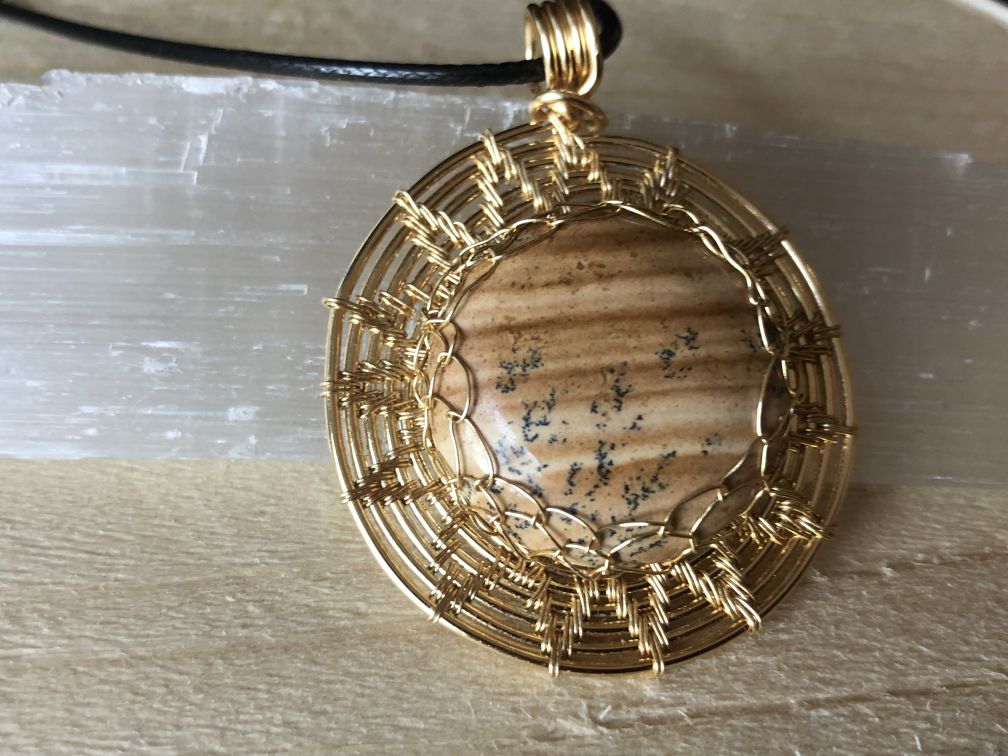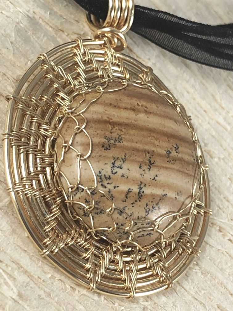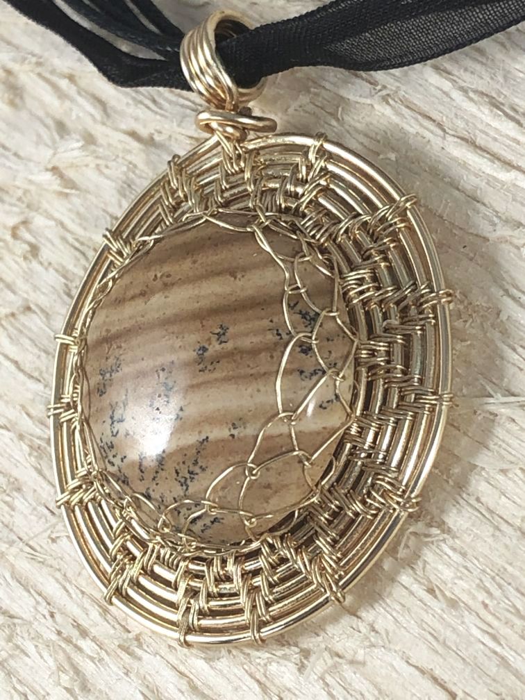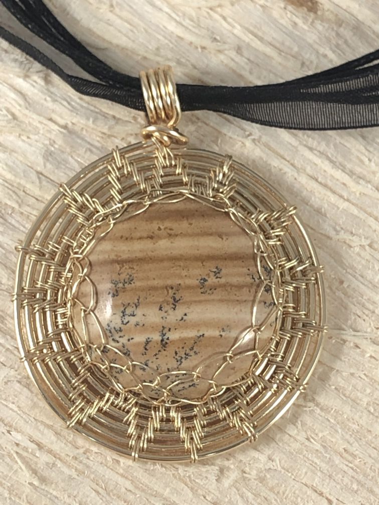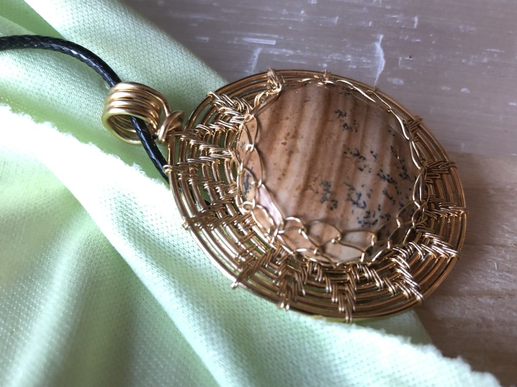 Ce jaspe paysage est monté sur un soleil rayonnant en cuivre doré. Il est accompagné d’un cordon multibrin en coton et organza.