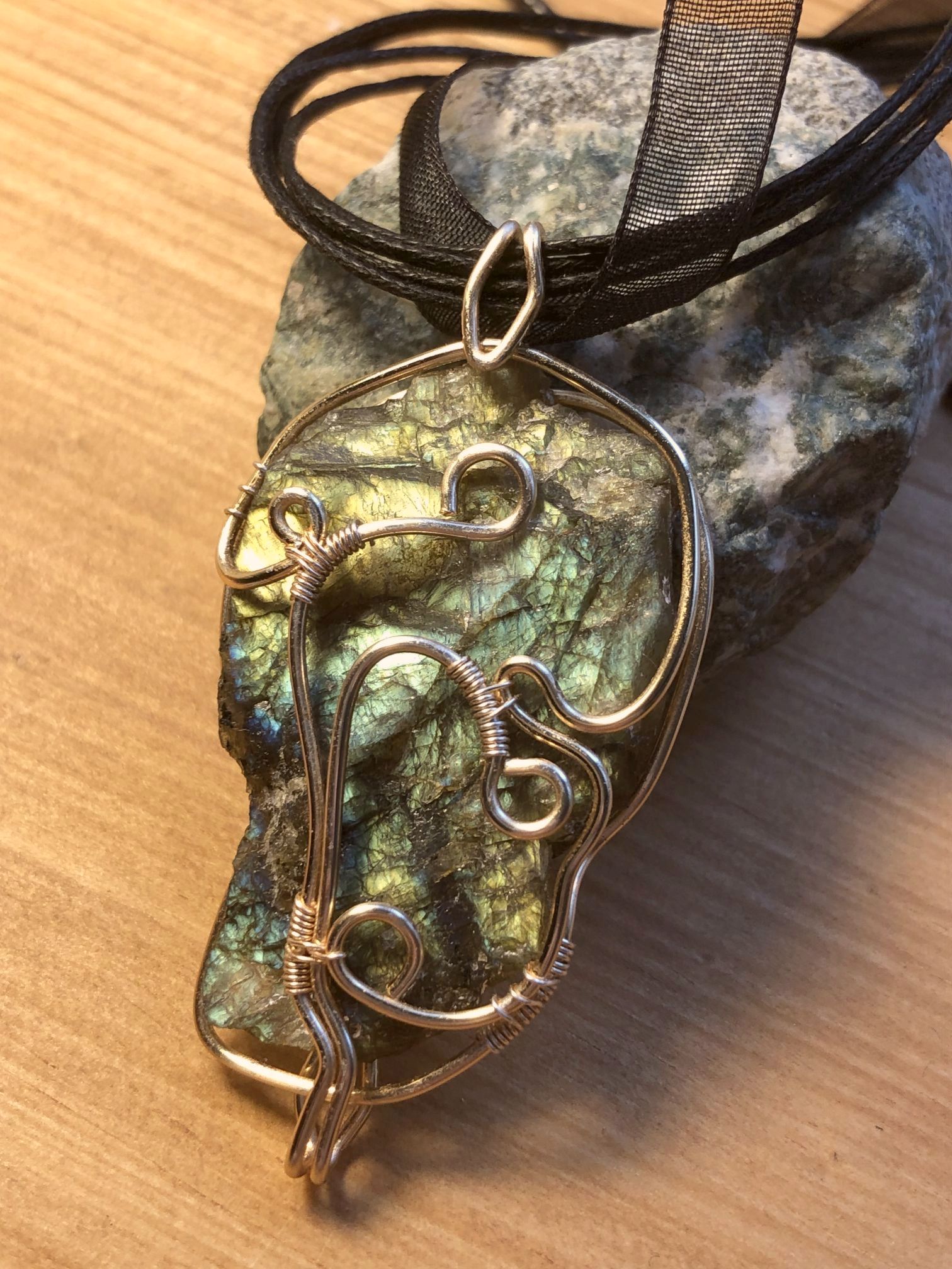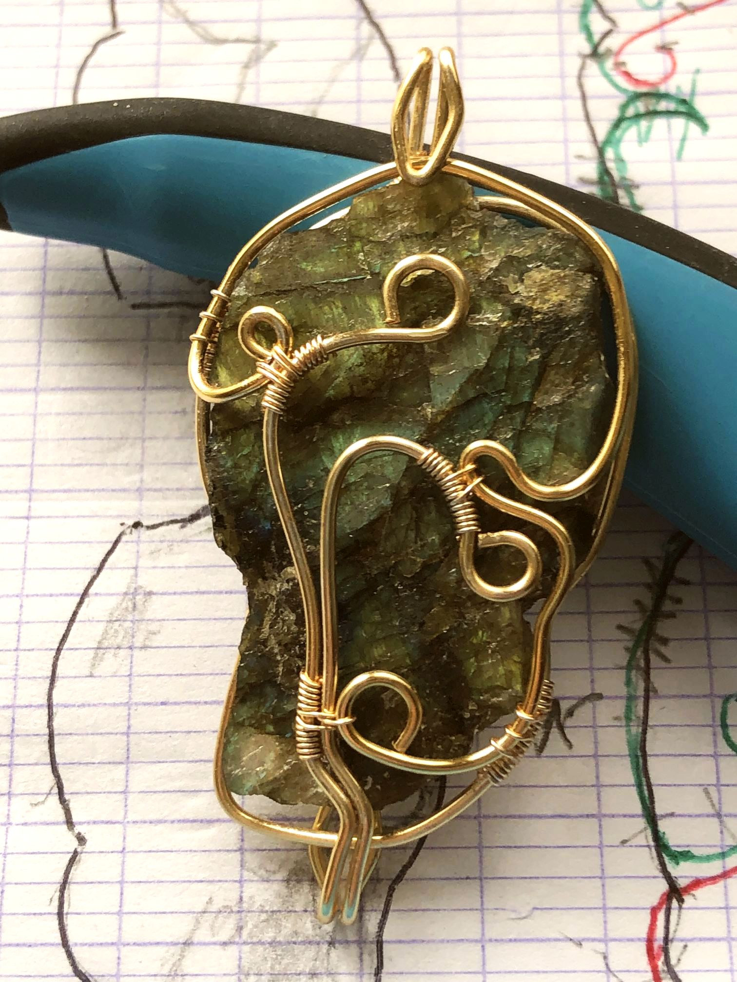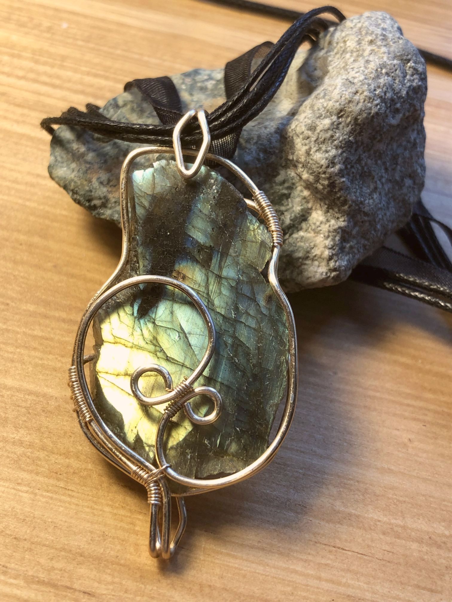 C’est une labradorite aux éclats verts et bleus, habillée d’arabesques dorées. Elle a cette particularité d’être semi-brute : 1 face plie et 1 face brute. Chaque face resplendit de ses plus beaux reflets, et pour la sublimer, j’en ai fait un pendentif double. Ainsi vous rayonnerez des plus beaux reflets de cette pierre, dans 2 styles très différents.