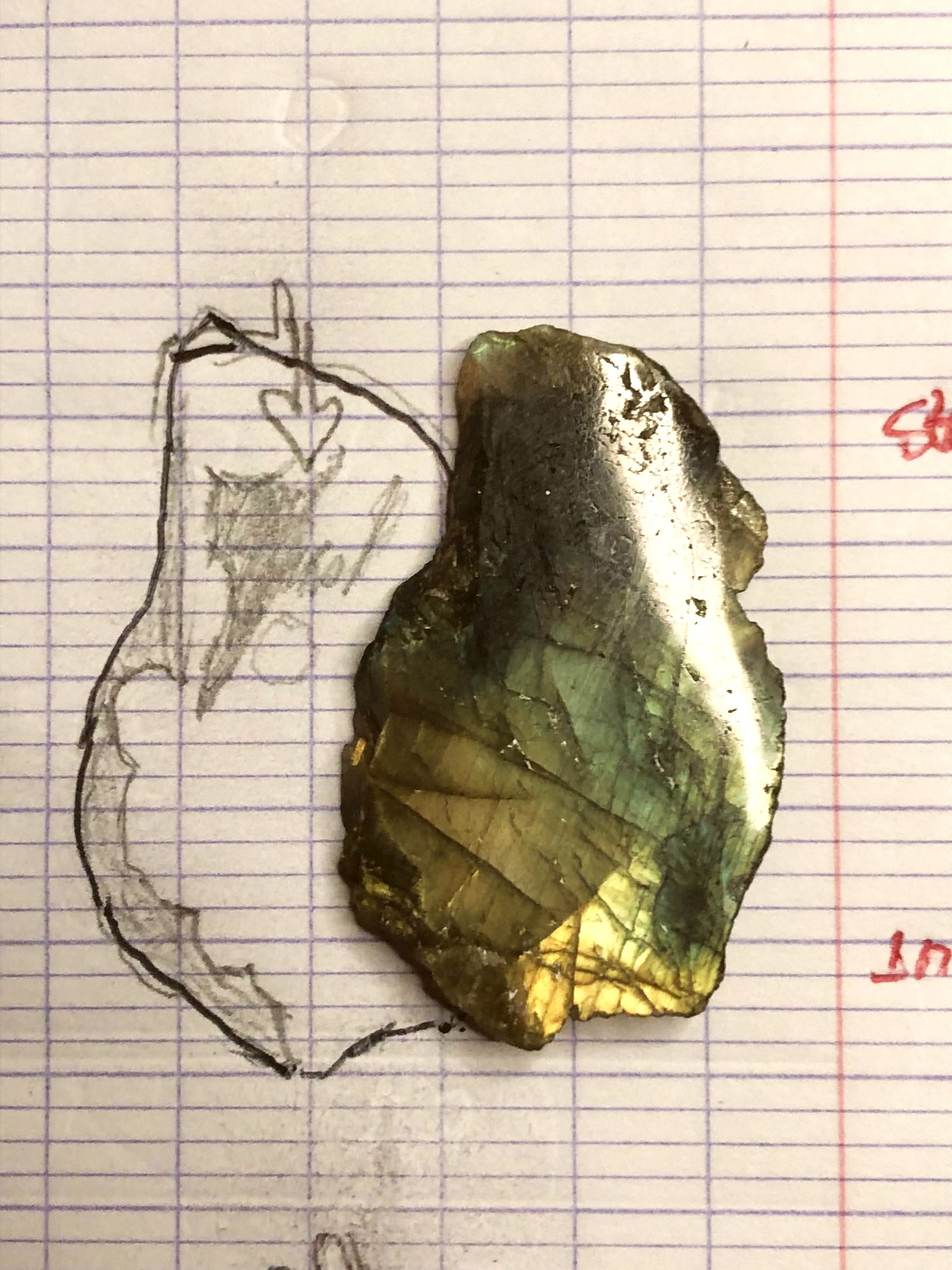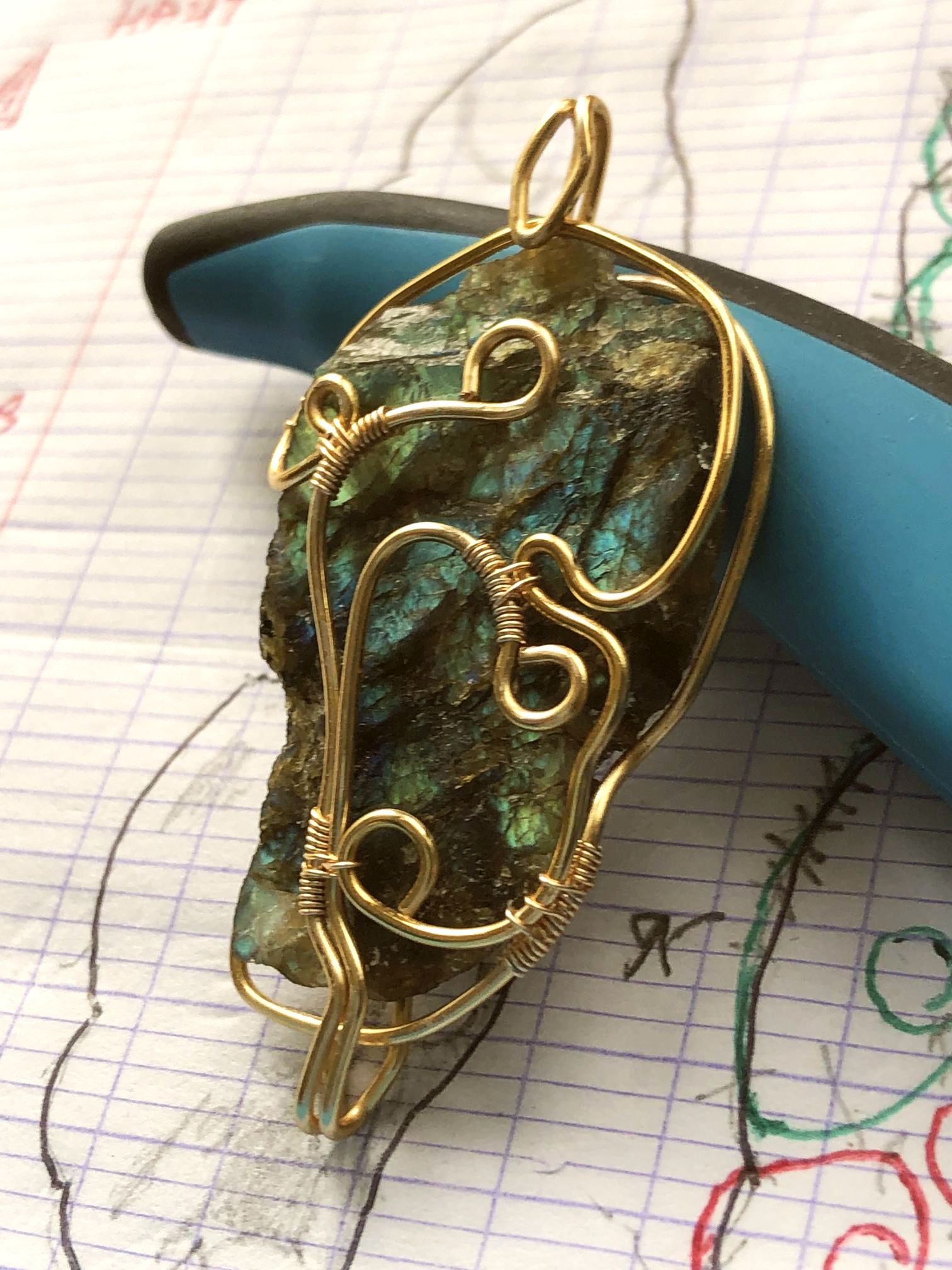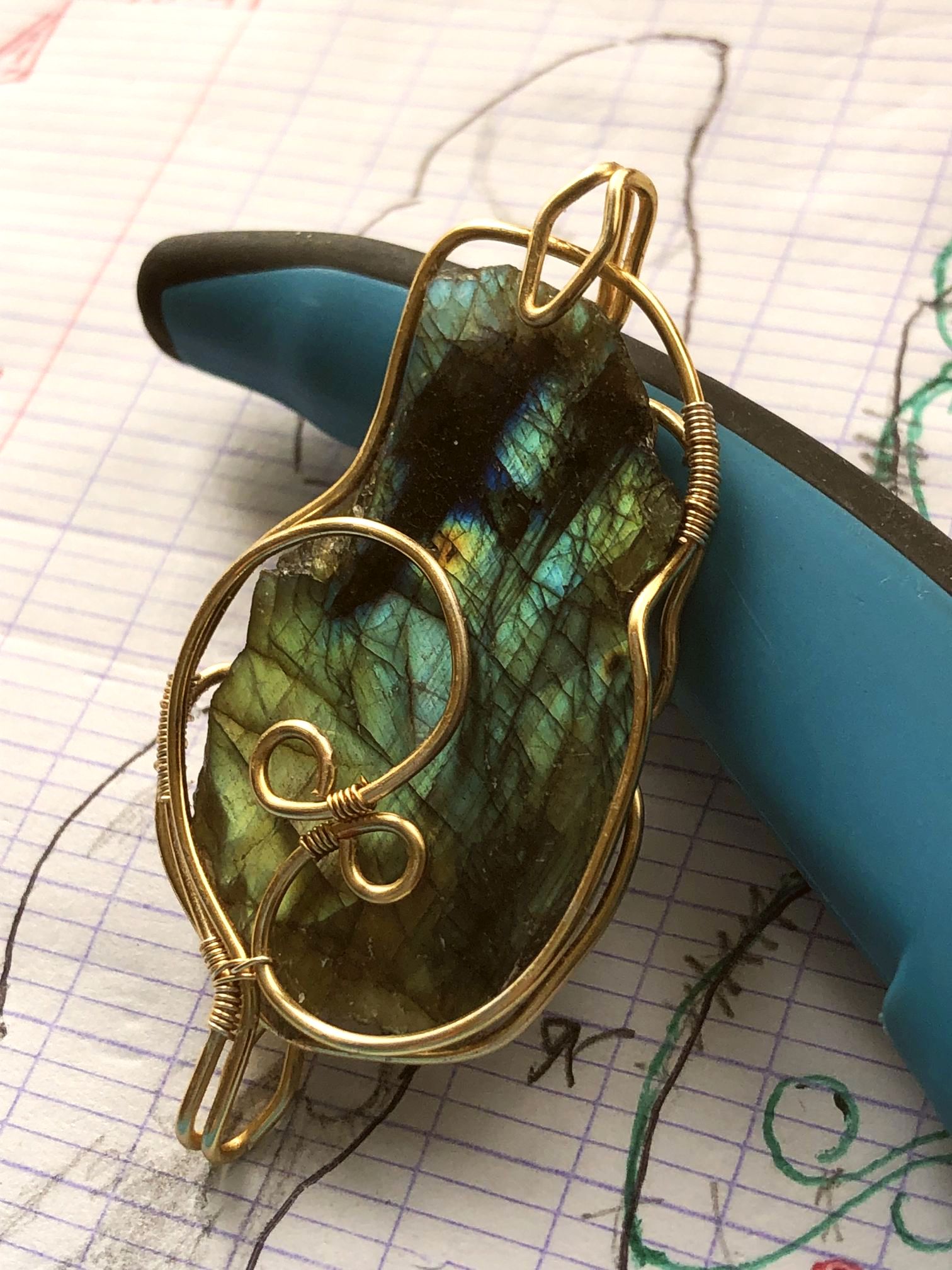 C’est une labradorite aux éclats verts et bleus, habillée d’arabesques dorées. Elle a cette particularité d’être semi-brute : 1 face plie et 1 face brute. Chaque face resplendit de ses plus beaux reflets, et pour la sublimer, j’en ai fait un pendentif double. Ainsi vous rayonnerez des plus beaux reflets de cette pierre, dans 2 styles très différents.