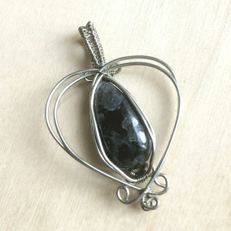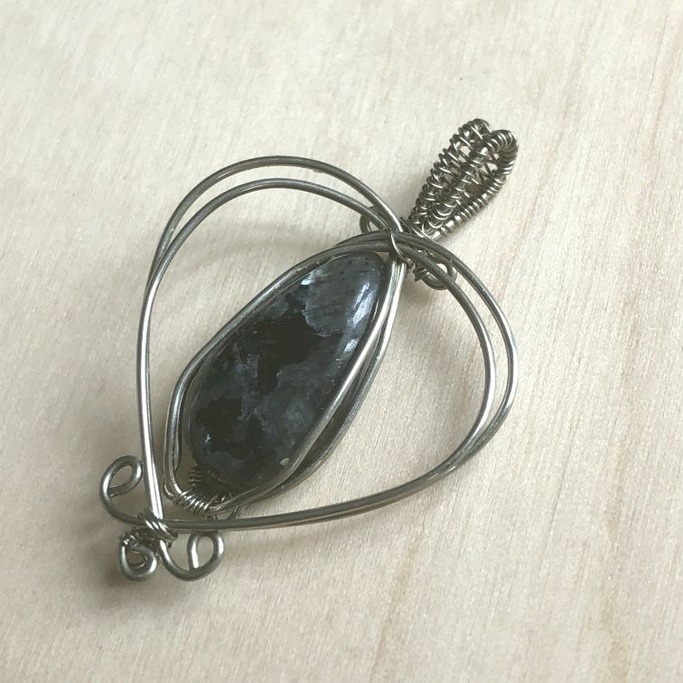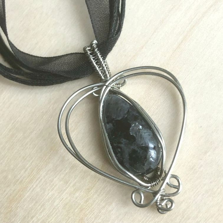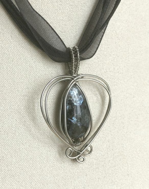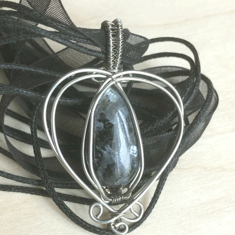 Cœur de cuivre argenté ajouré à la patine naturelle, avec au centre une goutte de larvikite, et accompagné d’un cordon noir multibrin en coton et organza.