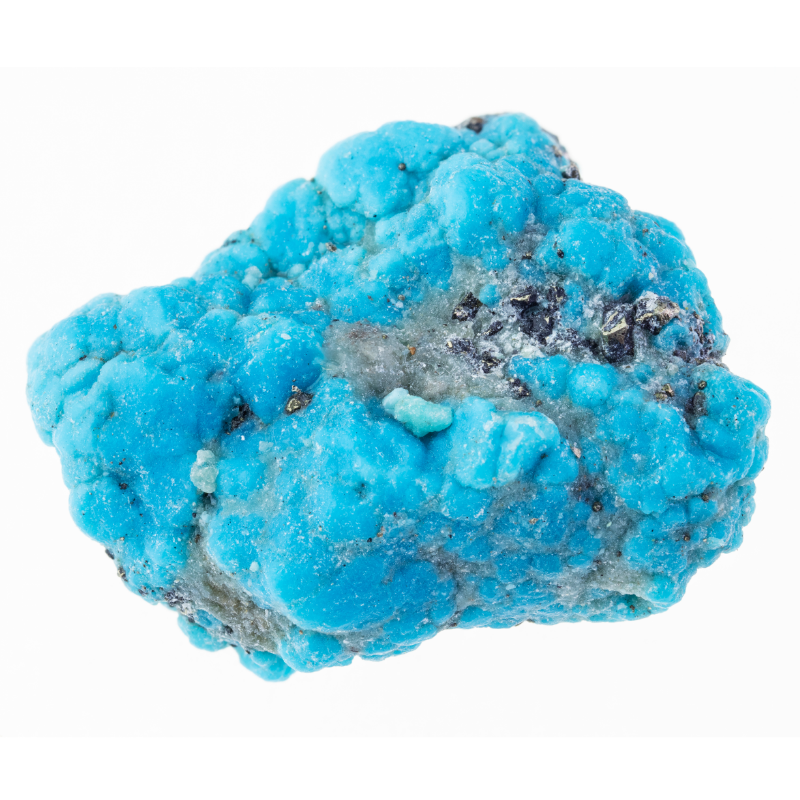 Elle se présente en masses compactes, et plus rarement en petits cristaux. Elle peut se confondre avec la Variscite ou la Chrysocolle, voire avec de la Howlite teintée artificiellement. La turquoise est un phosphate d’aluminium et de cuivre, ce qui lui donne sa couleur bleue, voire verte en présence de fer.