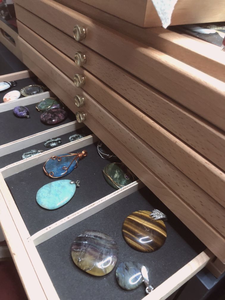 En ce qui me concerne, j’ai choisi une boite initialement prévue pour ranger des crayons, et j’ai recouvert les tiroirs de mousse pour éviter que les pierres glissent les unes contre les autres. Cela me permet aussi de pouvoir les voir facilement lorsque je prépare un nouveau projet.