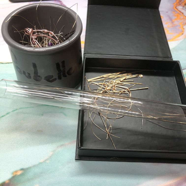 Pour les fils fins et dont la longueur est encore importante, je les plie pour les ranger dans des éprouvettes en verre.